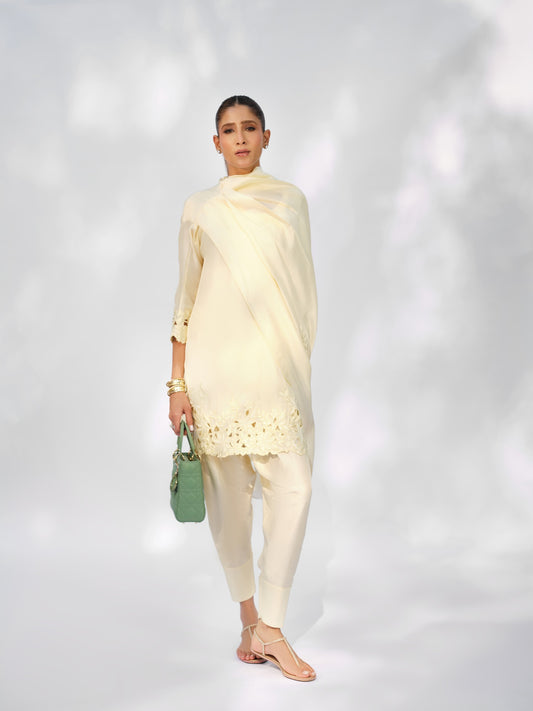 The Inara Set is presented in a luminous ivory tone, intricately adorned with tonal embroidery...