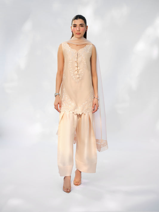 The Amil Set unfolds in a delicate light pink hue, adorned with intricate tonal embroidery...