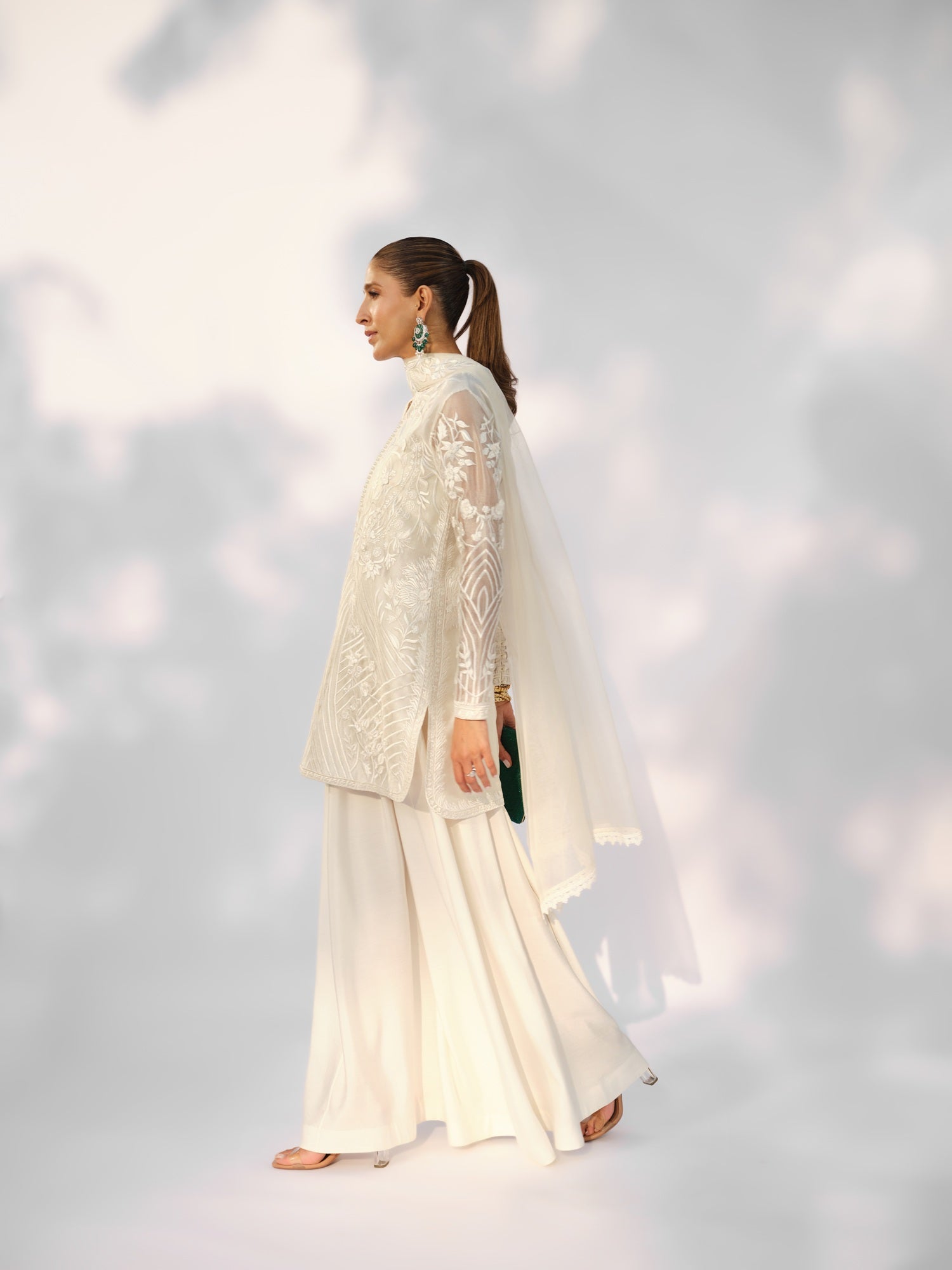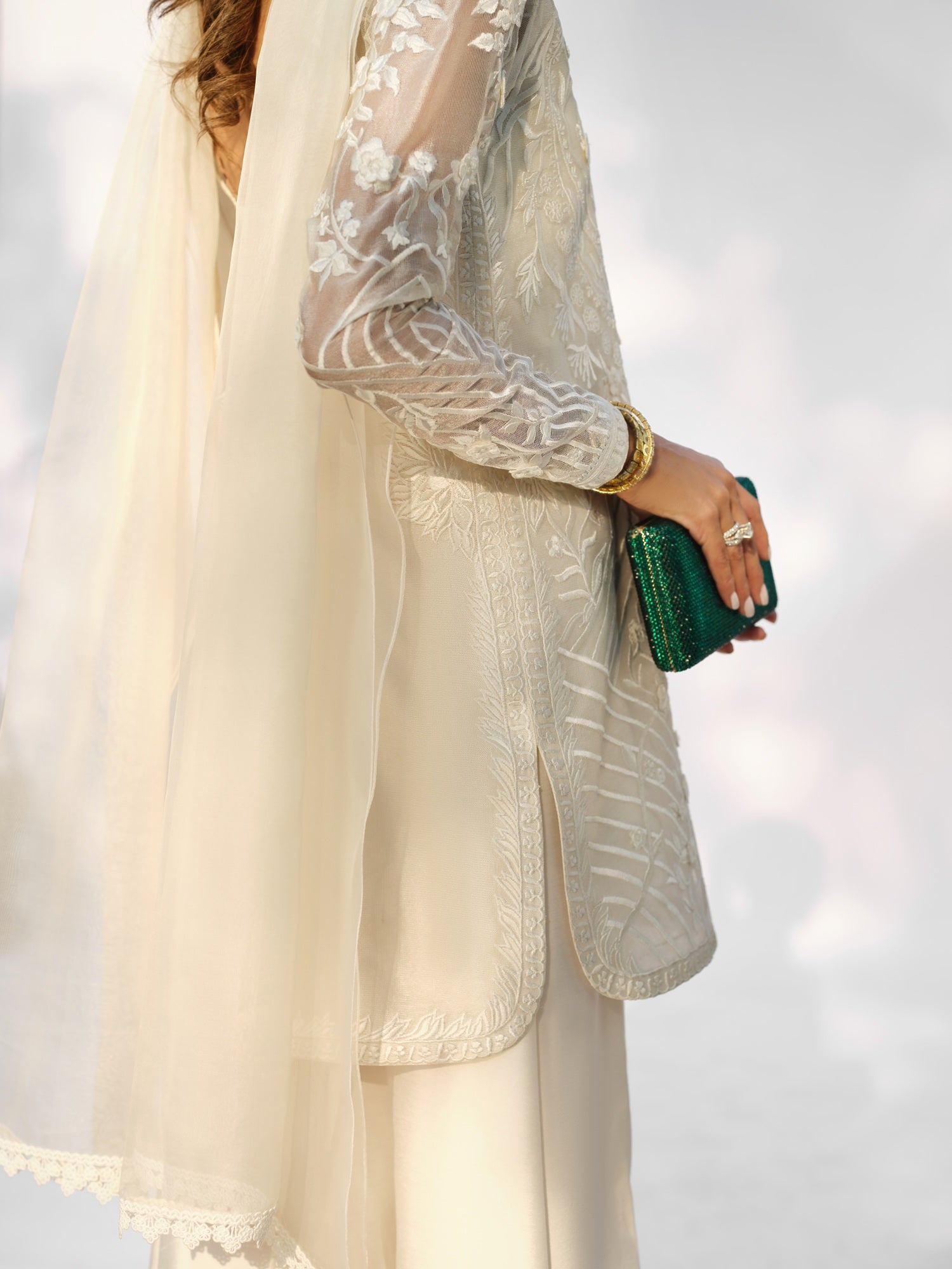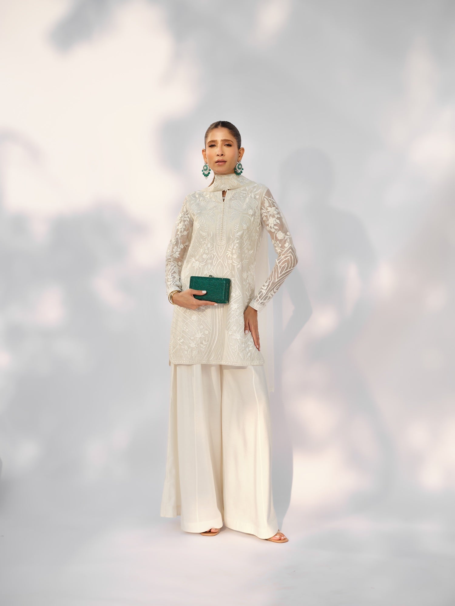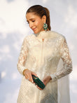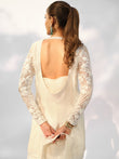 The Inara Set is presented in a luminous ivory tone, intricately adorned with tonal embroidery that contours the silhouette with quiet precision. Delicately embroidered sheer sleeves add lightness, while the structured neckline and elongated cut create a composed, sculpted form. A striking open back introduces subtle drama, balanced by fluid wide-leg trousers and an embroidered dupatta that completes the ensemble with layered texture and refined elegance.