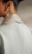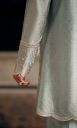 Intricate embroidery enriches the front and collar, featuring layered scalloped patterns and delicate floral motifs. The finely detailed cuffs mirror the design, adding balance and structure. Accented with subtle pearls and precise finishing, this look embodies refined craftsmanship and timeless elegance.