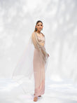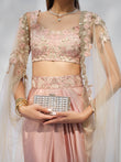 The Sophie Set unfolds in a soft blush palette, where intricate floral embroidery meets fluid structure. The sculpted bodice flows seamlessly into a high-waisted draped skirt, designed with soft front pleating and a wrap-inspired fall for graceful movement. The fluidity of the skirt contrasts beautifully with the precision of the embroidery, creating a balance between romance and refinement. A sheer embroidered cape completes the ensemble with lightness and understated radiance.